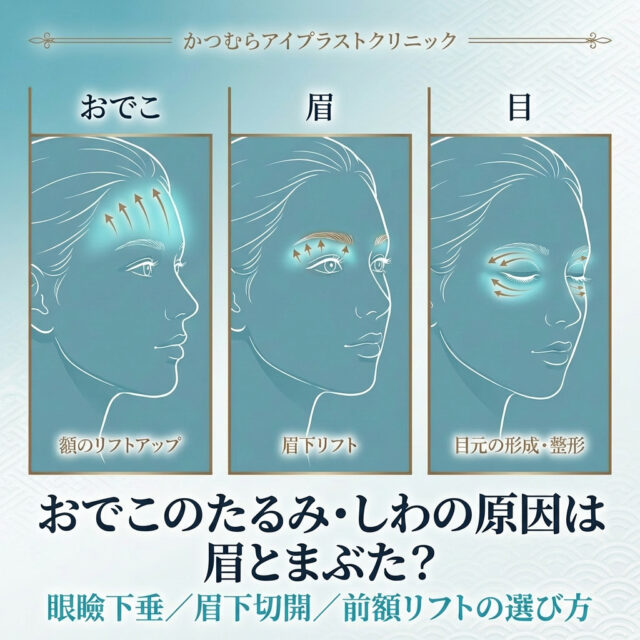 おでこリフトは、眉毛下垂や上まぶたのたるみを改善し、顔全体の印象を若々しく保つ効果があります。当院では、患者様の自然な表情を大切にしながら、個々の状態に最適なリフト法を提供します。